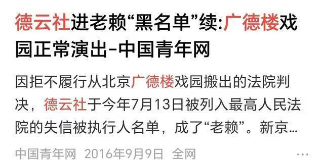 02谦儿大爷也跟着塌房了? 几年前,德云社还因为广德楼戏院的房屋产权纠纷被列到了失信被执行人名单里。 广德楼本来是国家的资产,结果被北歌给占了,然后租给了德云社,德云社连带着一起被告上法庭。